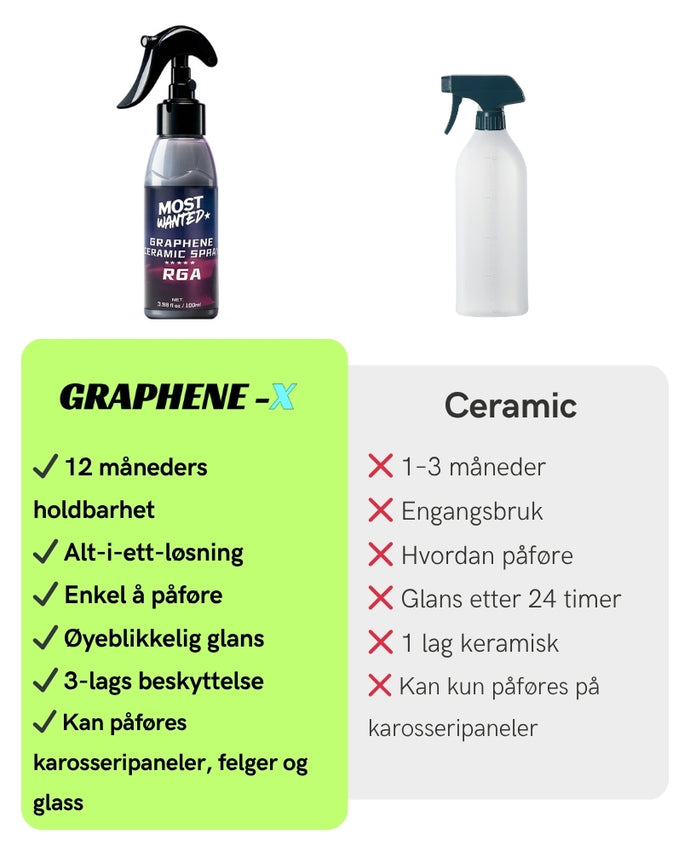 Ett produkt, total beskyttelse på alle overflater, inkludert karosseripaneler, frontrute og felger. Oppgrader til Graphene-X i dag!